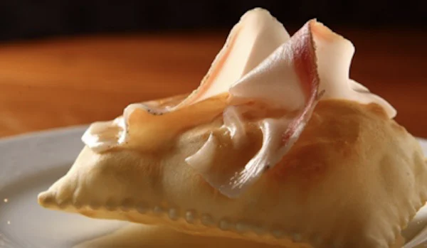 パルマの郷土料理 "トルタフリッタ" にハンドスライサーのみで実現できる極薄にカットされた生ハムを乗せ楽しむのがパルマ流。